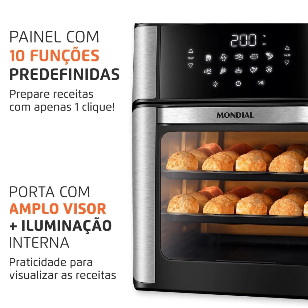 Na prática, a Air Fryer Forno Mondial entrega o que promete: agilidade e versatilidade. O espaço interno de 12L permite preparar duas receitas ao mesmo tempo, usar assadeiras maiores e cozinhar alimentos que não cabem em air fryers de gaveta.