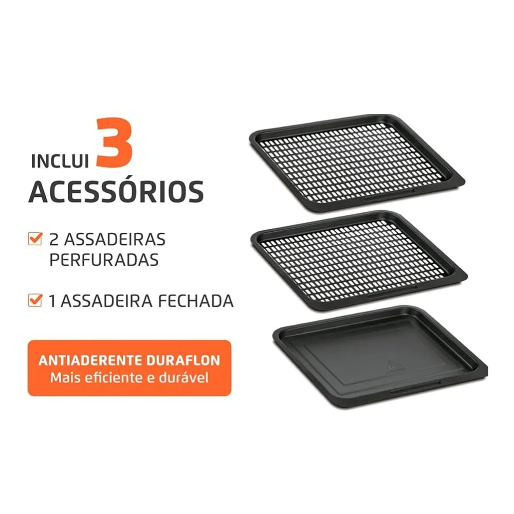 | Itens inclusos | Assadeiras, cesto, bandeja coletora e luva de silicone (varia por lote) |